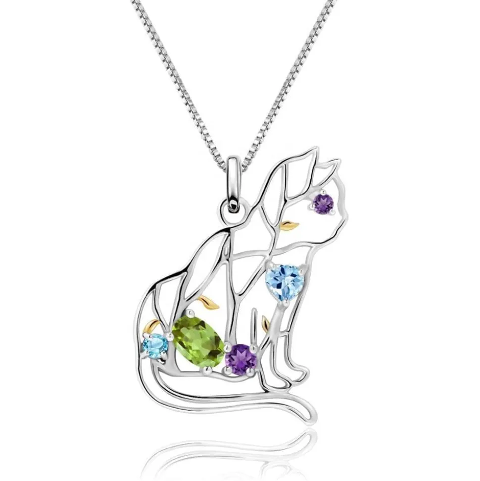 Designer Unique Cat Necklace Sterling Silver & REAL Gemstones! Garnet, Topaz, Peridot