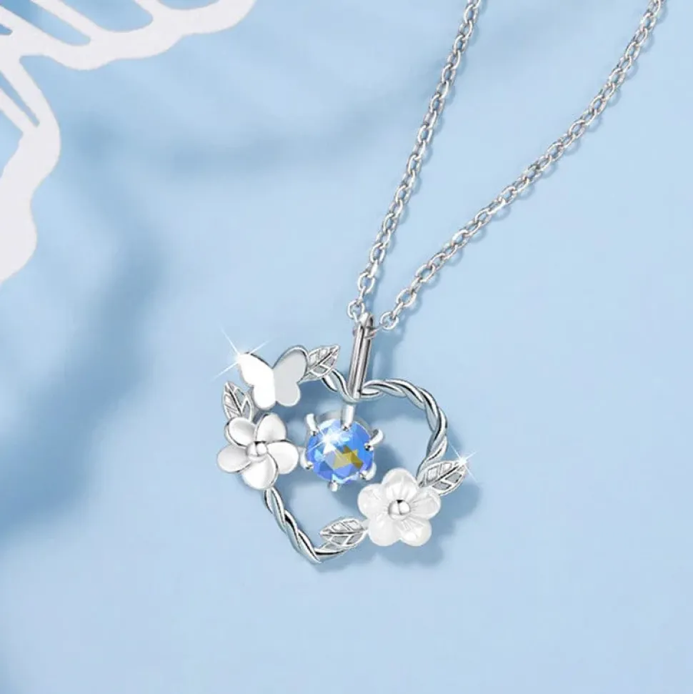 Butterfly on a Twisted Silver Heart with Flowers 925 Sterling Silver